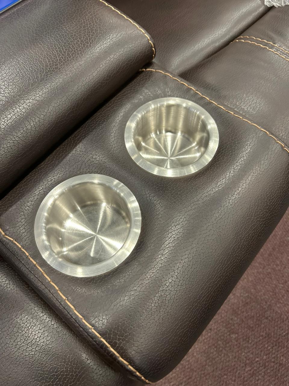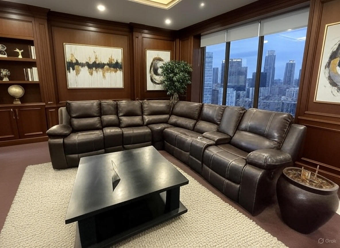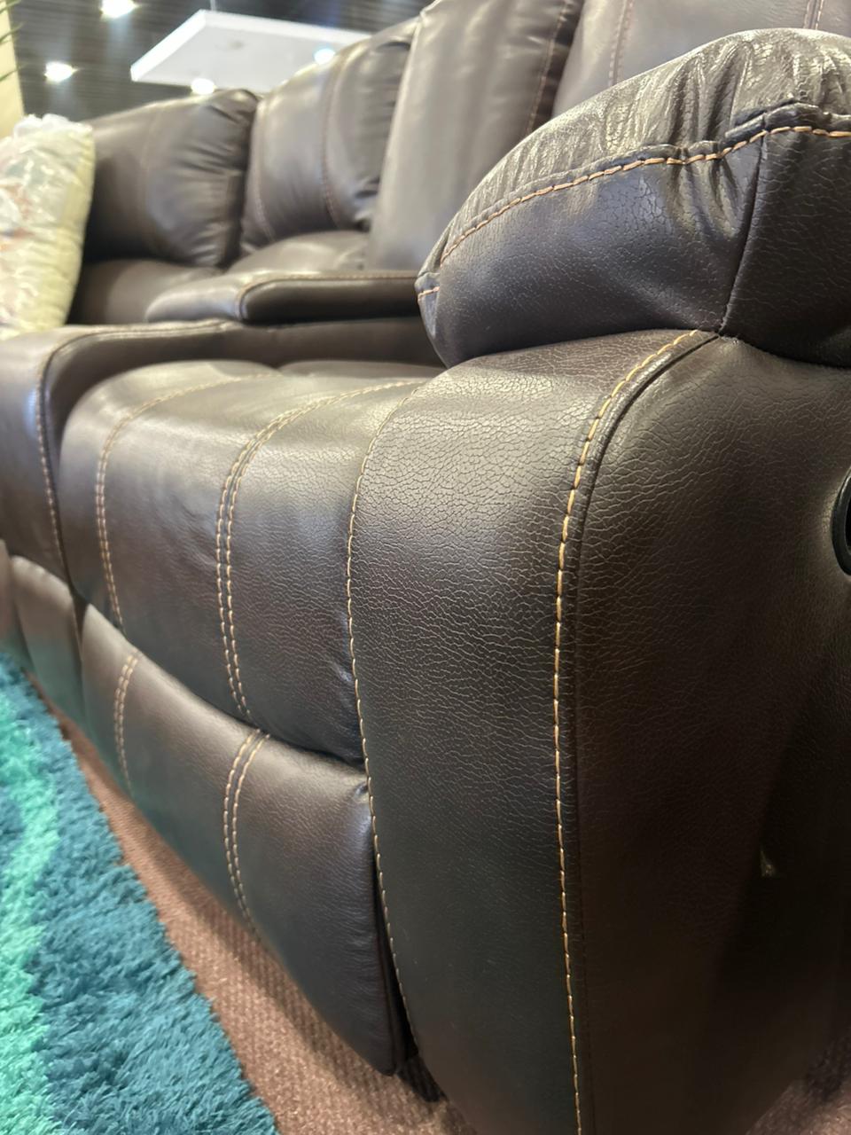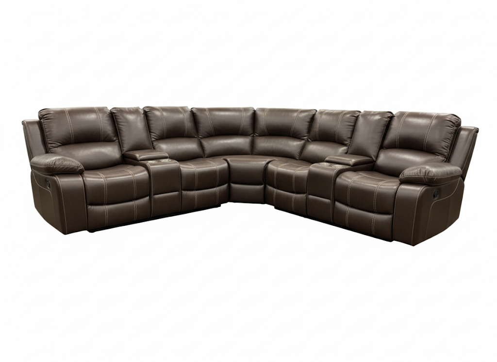 The Induna R71K Reclining Sectional Sofa is the ultimate centerpiece for your home theater or living space, offering expansive seating, luxurious comfort, and versatile functionality. Upholstered in a durable, easy-care leather-look material in a rich, dark brown finish with contrasting stitching, this seven-piece sectional includes two recliners (one on each end) and features built-in convenience. With multiple cup holders and spacious storage consoles, the Induna R71K is designed for maximum relaxation, movie nights, and entertaining.