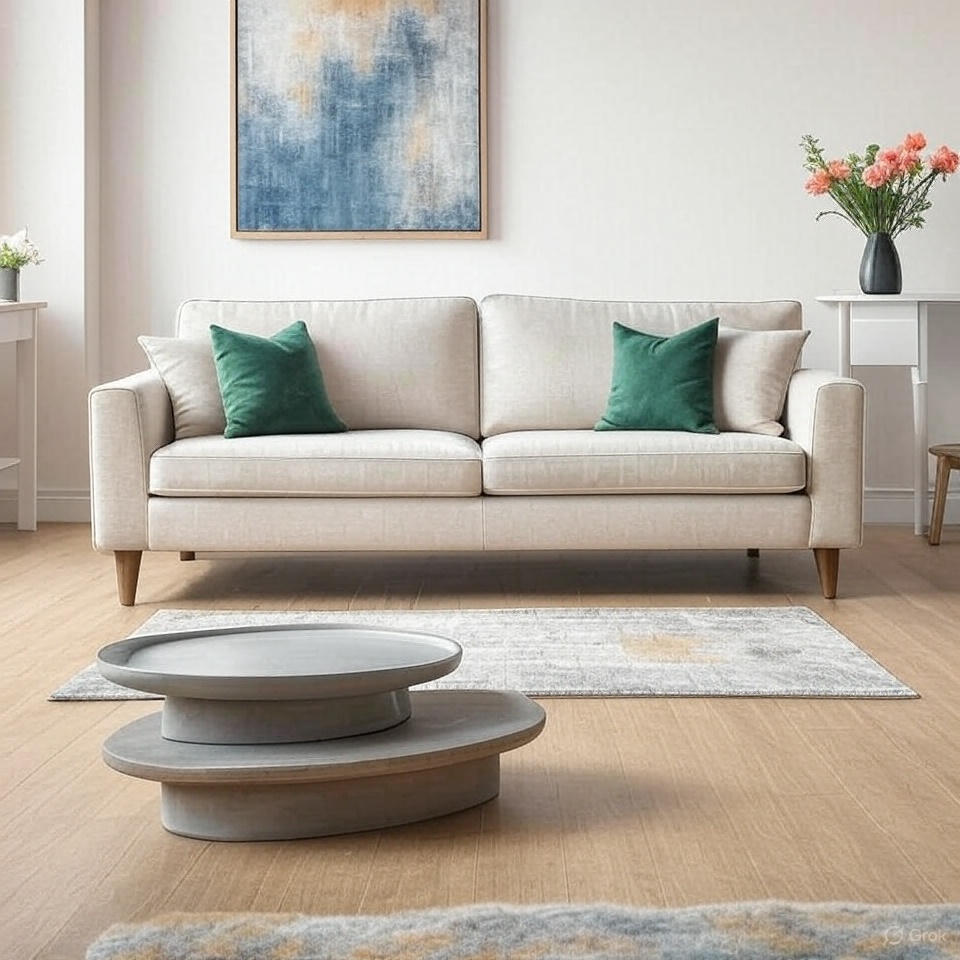 Sink into unparalleled comfort with our Cream Mid-Century Sofa, a versatile piece that blends clean lines with cozy appeal. Upholstered in soft cream fabric and accented by vibrant green throw pillows, this sofa features tapered wooden legs and generous cushioning for everyday lounging or entertaining. Its minimalist design fits seamlessly into living rooms, offices, or family spaces, offering seating for three with a timeless aesthetic that never goes out of style. Durable and inviting, it's the heart of any modern home.